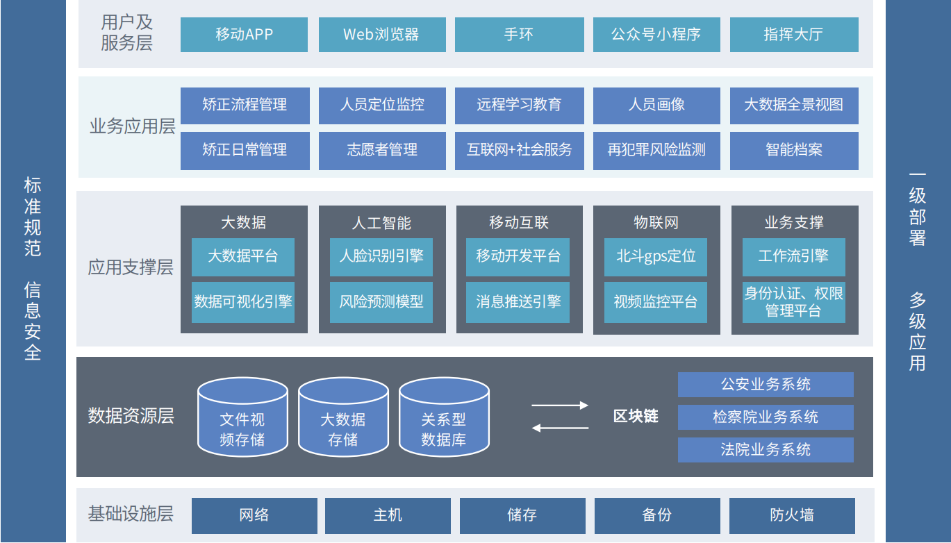 司法智慧矯正平臺(tái)依據(jù)司法部“一個(gè)平臺(tái)、 兩個(gè)中心、三大體系、四個(gè)智慧化融合”指導(dǎo)思想建設(shè),涵蓋社區(qū)矯正一體化大平臺(tái)(工作人員PC端、工作人員移動(dòng)端、矯正對(duì)象移動(dòng)端、社會(huì)力量移動(dòng)端)、數(shù)據(jù)中心、指揮中心等。建設(shè)過(guò)程中,嚴(yán)格按照司法部安全規(guī)范、運(yùn)維規(guī)范、基礎(chǔ)規(guī)范、業(yè)務(wù)規(guī)范、技術(shù)規(guī)范,充分融合AI(人工智能)、大數(shù)據(jù)分析技術(shù)、移動(dòng)互聯(lián)技術(shù)、物聯(lián)網(wǎng)技術(shù),打造集業(yè)務(wù)管理、移動(dòng)執(zhí)法、指揮調(diào)度、輔助決策、應(yīng)急處置等功能于一體的社區(qū)矯正全智能化體系,以數(shù)據(jù)一體 化 、管理智能化 、移動(dòng)互聯(lián)化、指揮可視化為目標(biāo),構(gòu)建社區(qū)矯正信息化新格局,實(shí)現(xiàn)現(xiàn)代信息技術(shù)與社區(qū)矯正業(yè)務(wù)全流程智能深度融合。