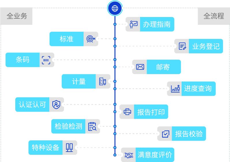 通過建立業(yè)務登記、預約服務、進度查詢、網(wǎng)上收費、報告打印、物流查詢、滿意度評價等工作流程,實現(xiàn)計量、檢驗、特種設備、條碼業(yè)務的全程網(wǎng)上辦理,標準、認證認可、知識產(chǎn)權(quán)等業(yè)務網(wǎng)上轉(zhuǎn)接辦理,滿足企業(yè)便捷高效的服務需求。