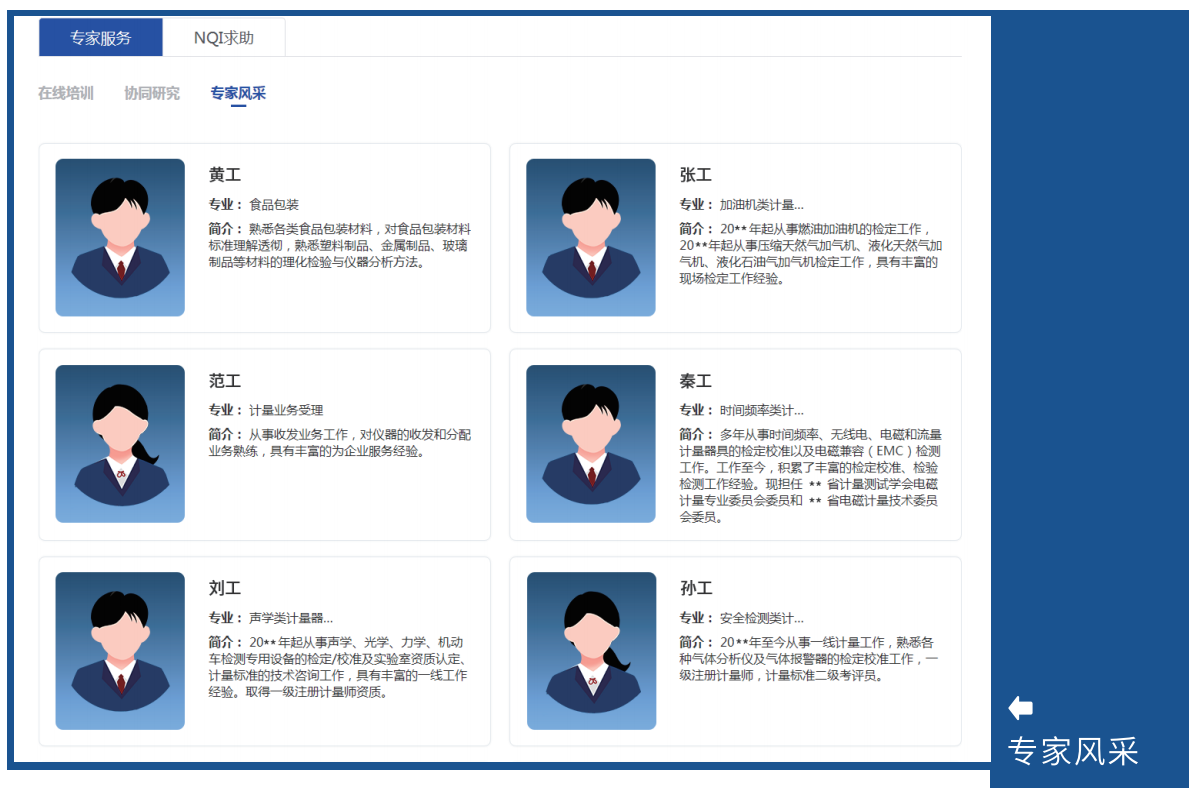 為企業(yè)提供專家服務和NQI求助。專家服務方面。企業(yè)可以通過協(xié)同研究、在線培訓、在線會議、預約服務等多種渠道,實現(xiàn)與各領域?qū)<业幕樱鉀Q生產(chǎn)經(jīng)營難題。NQI求助方面。分行業(yè)、分領域搭建NQI求助園地,集中大家智慧,解決求助問題。