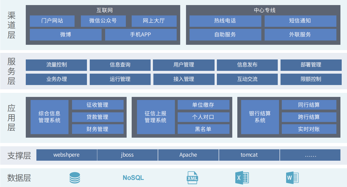 住房公積金綜合服務(wù)平臺主體建設(shè)依據(jù)住房和城鄉(xiāng)建設(shè)部發(fā)布的《住房公積金信 息化建設(shè)導(dǎo)則》、《住房公積金基礎(chǔ)數(shù)據(jù)標(biāo)準(zhǔn)》、《住房公積金信息系統(tǒng)技術(shù)規(guī)范》、 《住房公積金綜合服務(wù)平臺建設(shè)導(dǎo)則》等標(biāo)準(zhǔn),打造了高效、便捷的“業(yè)務(wù)+服務(wù)”模式。平臺以公積金核心業(yè)務(wù)系統(tǒng)為主線, 擴展了網(wǎng)站、網(wǎng)上營業(yè)廳、手機APP、微信公眾號、微博、短信、熱線、自助智能終端等服務(wù)渠道,實現(xiàn)住房公積金征收、貸款、 財務(wù)等線上、線下全業(yè)務(wù)覆蓋,全流程管理,有效支撐了住房公積金行業(yè)的政務(wù)服務(wù)體系。
