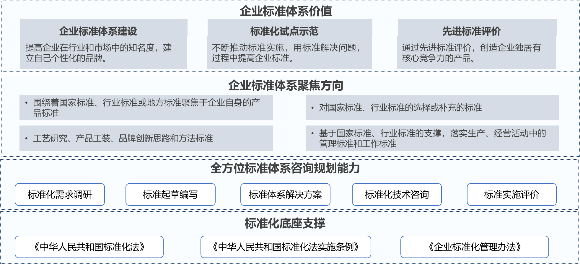 基于海頤咨詢沉淀的標準體系規(guī)劃能力,提供企業(yè)全維度、全過程的標準體系起草、編寫、實施、評價等咨詢服務(wù)。以標準體系為企業(yè)抓手,形成企業(yè)創(chuàng)新與產(chǎn)業(yè)生態(tài)共贏發(fā)展的新模式。
